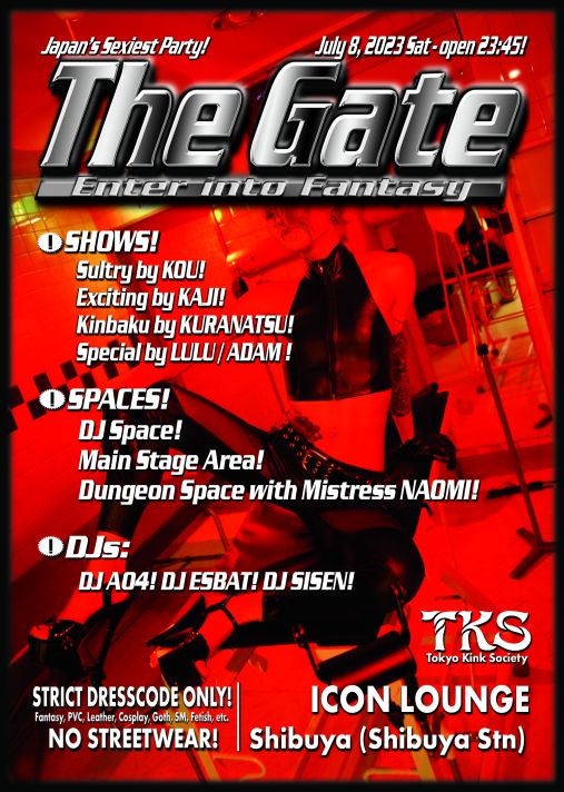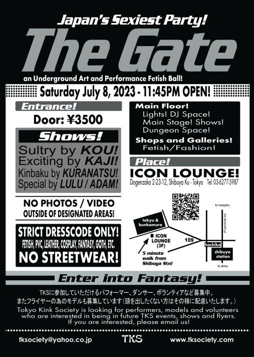 東2-24-4 Shibuya-ku, Tokyo, Japan 150-0011 (Paste the above address in google-maps - it will take you there!) When: Periodically: Please see schedule at top of page Entrance cost: 500 yen Drinks charge: 500yen ~ 1000 yen (please buy at least 1 drink from bar so they keep welcoming us) Other Charges: 500yen admission Dresscode: None The Tokyo Kink Society Organization Committee 240422 NEXT FETISH PARTY! TKS - THE GATE! LUXURIOUS NIGHTCLUB! Special venue!.. Special shows!.. Special Night!.. ![]() TKS Fashion Model: SIBUKI! Photographer: CHARM! July 20, 2024 (Sat) @ ICON LOUNGE! (luxurious venue!) Shibuya, Tokyo! 11:45pm open! (Tokyo, Japan - Shibuya Metro Station) Dougenzaka 2-23-12 (3F), Shibuya Ku, Tokyo [across from Tokyu / Bunkamura] Tel: 03-6277-5987 11:45PM START! 5:00AM END To Enter ICON LOUNGE * * * YOU MUST BRING ID PROOF OF AGE * * * (Japan National Insurance Card, Drivers License, Passport, Gaijin Card..etc) STRICT DRESSCODE ONLY! FANTASY, SM, FETISH, GOTH, COSPLAY, CYBER..ETC! NO STREETWEAR! **NO CAMERAS! - NO VIDEO!**
