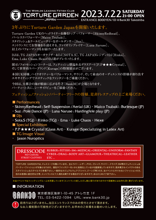 ![]() 2023/7/22 Saturday @ Bank30 21:00 open / Entrance 8000Yen/1D Top performer [SkinnyRedhead] will headline Torture Garden UK, The world famous burlesque performer [Maico Tsubaki], the stylish and cool pole dancer [Suzuka] and the world famous burlesque performer [Mika Kurokawa], Suzuka, a stylish and cool-beautiful pole dancer, will welcome you at the entrance,Luna Naruse, a violinist, will welcome you at the entrance,