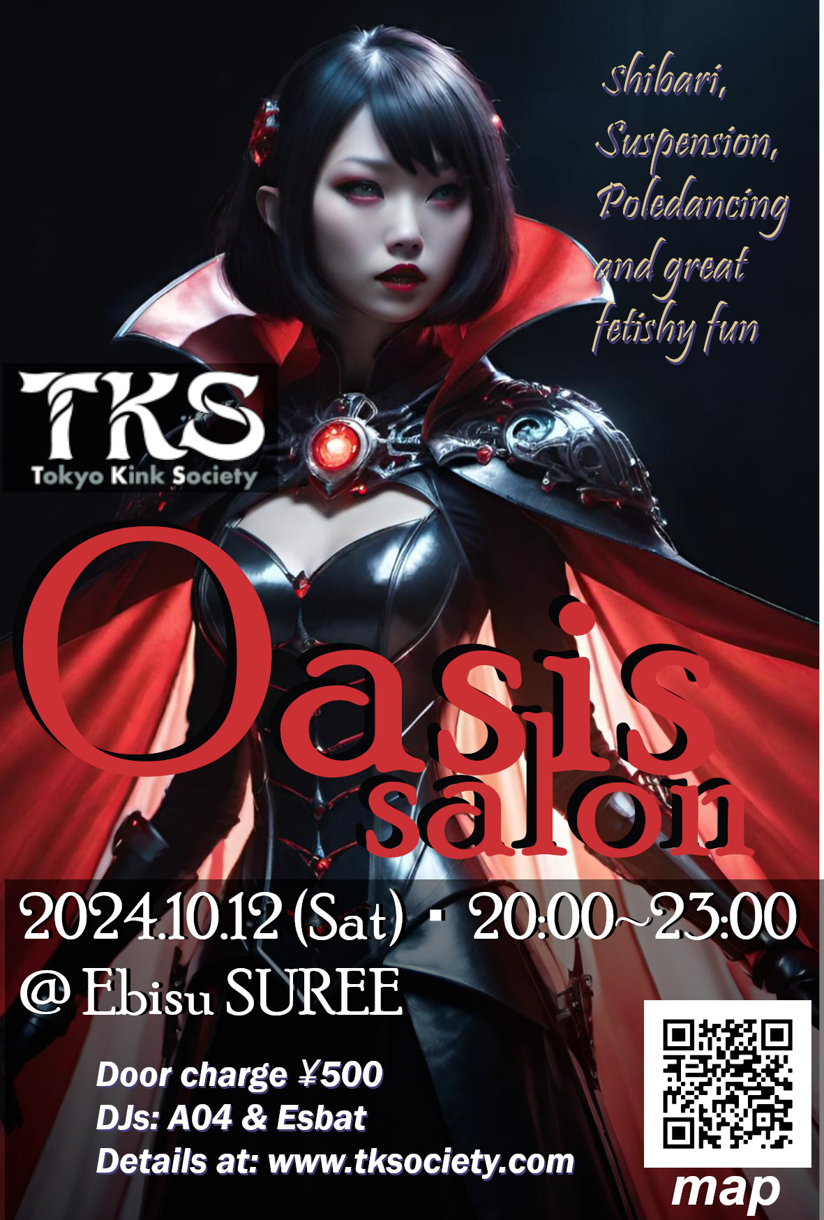 When: Periodically: Please see schedule at top of this page or on social media Entrance cost: 1000 yen (all TKS/GATE volunteers, performers, models and staff are free entrance!) (cash only, no credit cards, no QR Code payment apps) Drinks charge: 600 yen ~ Other Charges: There are no other charges Dresscode: None, but dressing up is very very welcome! Many people will dress up! The Tokyo Kink Society Organization Committee 250607 * * New X/Twitter Account! * * We had to create a new X/Twitter account. For event information and discounts, please follow our new X account at: 250603 "Oasis" fetish lounge returns! - next at Ebisu SUREE on Saturday July 5th, 2025!