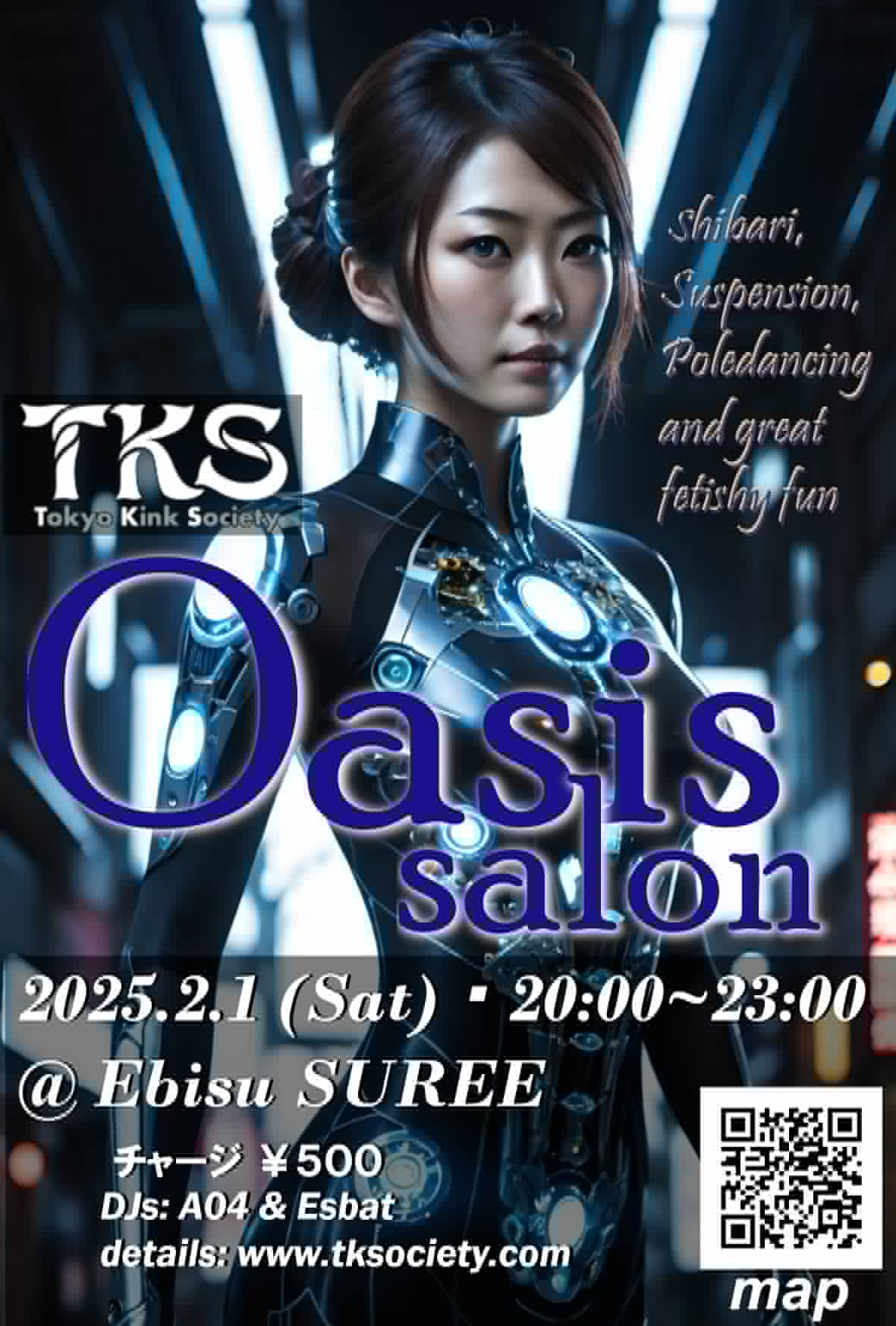 東2-24-4 Shibuya-ku, Tokyo, Japan 150-0011 When: Periodically: Please see schedule at top of page Entrance cost: 800 yen Drinks charge: 500yen ~ 1000 yen (please buy at least 1 drink from bar so they keep welcoming us) Other Charges: 800yen admission (all TKS/GATE volunteers, performers, models and staff are free entrance!) Dresscode: None The Tokyo Kink Society Organization Committee 250105 "Oasis" fetish lounge returns! - next at Ebisu SUREE on Saturday May 17th, 2025!