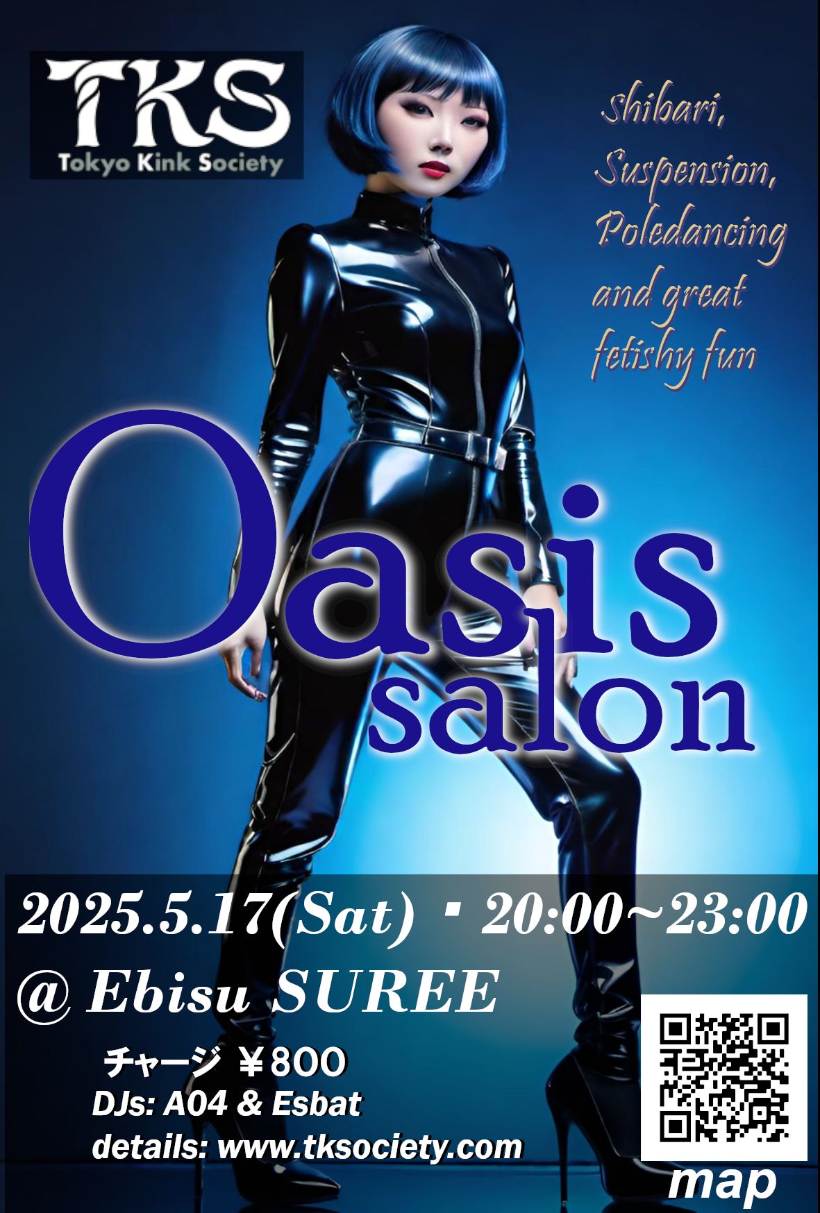 Bank 30 ---------------------------------------------------------------------- No advance sales. No advance sales, only at the door on the day of the event. Admission may be restricted, so early arrival is recommended. Please show your photo ID (*official ID) when entering the venue. Persons under the age of 20 are not permitted to enter the venue. ※ Must be 20 or over with Photo ID to enter. Thank you for your cooperation. ![]() "Oasis" fetish lounge returns! - next at Ebisu SUREE on Saturday November 5, 2022! OASIS Lounge returns in force to Ebisu SUREE! SUREE is a stylish and intimate club near Ebisu station! The club has a cool modern decor and comfortable spaces in a DJ setting! Bondage art, rope suspension (shibari, kinbaku) and poledancing by TKS Oasis girls also return to this lovely location in Ebisu on the Yamanote line! We